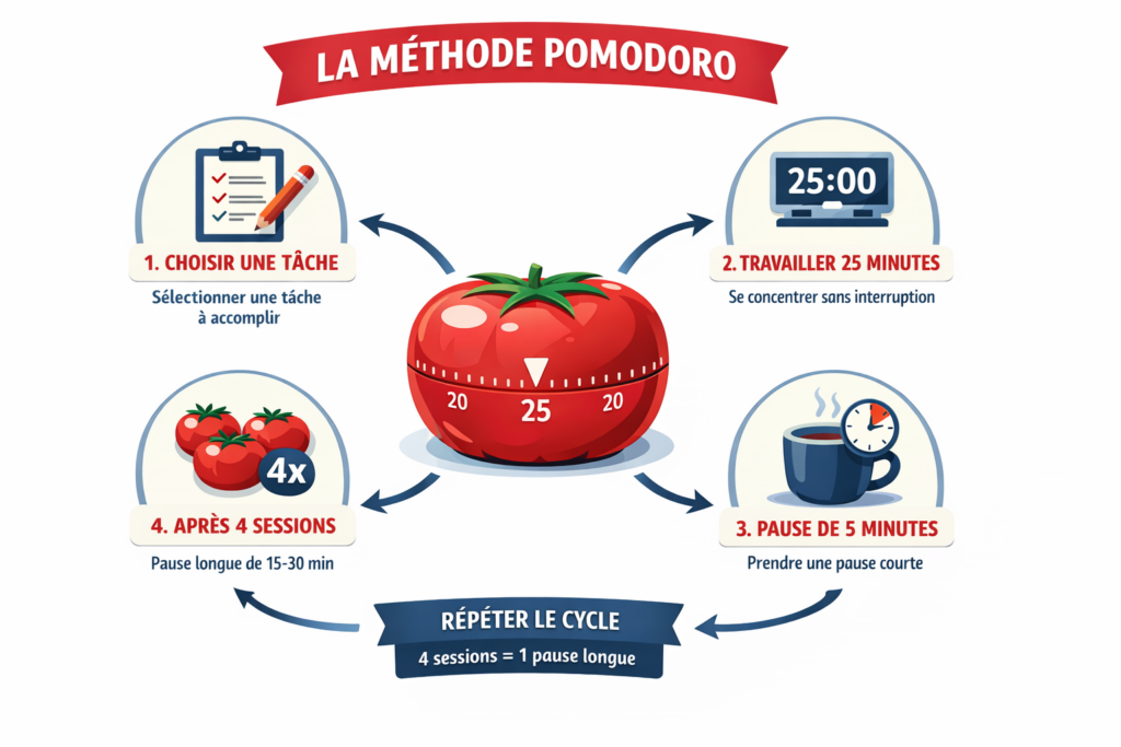 La méthode Pomodoro transforme une tâche intimidante en une action simple : “Je travaille seulement 25 minutes.” Cela réduit la résistance mentale au démarrage.